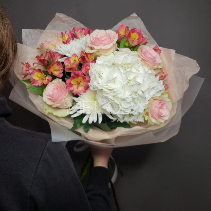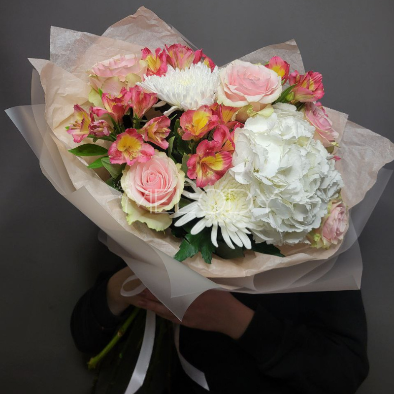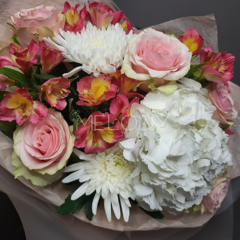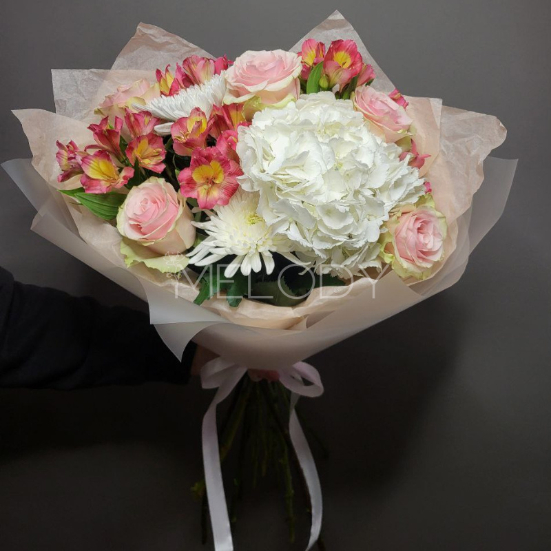 Этот букет — настоящая флористическая симфония в пастельных тонах. Пышная гортензия задает основной ритм и томную мелодию, подобно арфе. Пять розовых роз — это солирующие скрипки, ведущие страстную и нежную тему. Две одноголовые хризантемы звучат уверенными и глубокими аккордами виолончели, а пять альстромерий — лёгкие и жизнерадостные пассажи флейты, связывающие всю композицию воедино. Идеальный подарок для выражения самых искренних и глубоких чувств, который простоит невероятно долго .