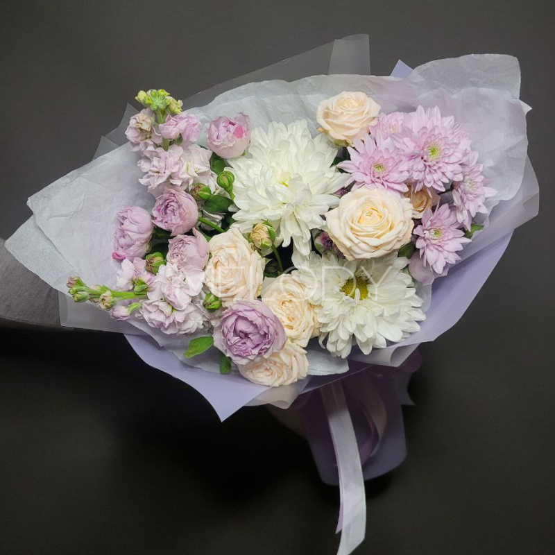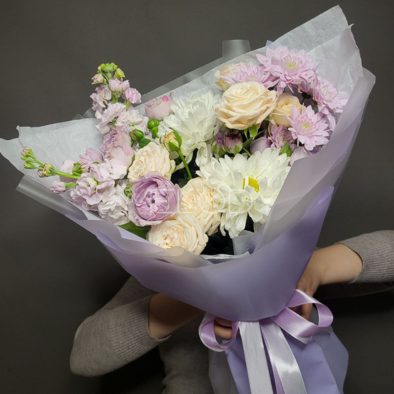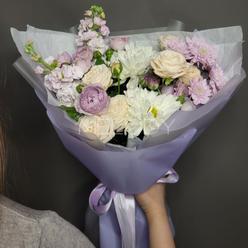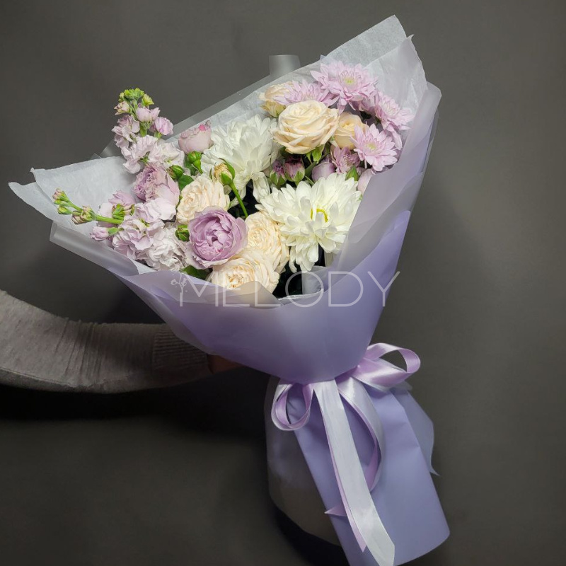 Этот букет — как нежный ноктюрн, наполненный тонким ароматом и изящными переливами оттенков. Две ветки маттиолы звучат тихой мелодией, напоминая лёгкие пассажи флейты в вечернем саду. Шесть кустовых роз и две одноголовые хризантемы создают гармоничный хор, где каждый бутон — это отдельная нота в общей партии. Пышная кустовая хризантема добавляет сочный аккомпанемент, завершая композицию. Оформление в бело-сиреневой упаковке усиливает образ, словно обрамляя музыкальное произведение в изящную рамку. Идеально для романтического вечера или в качестве подарка, который говорит о тонком вкусе.
