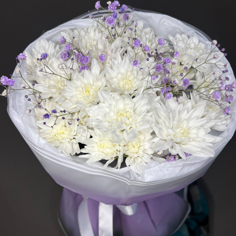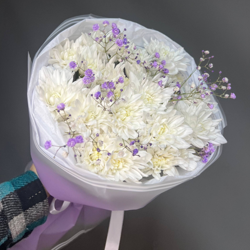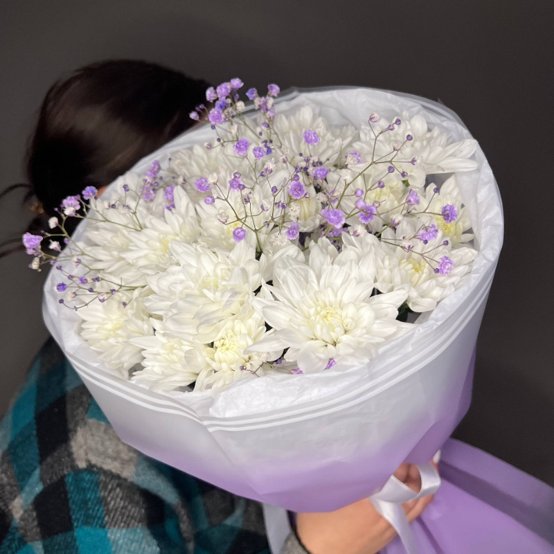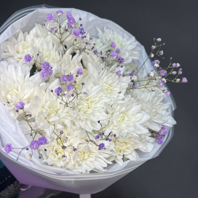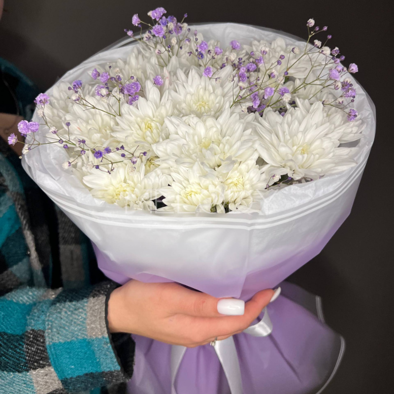 Воздушный и нежный букет, который словно сошел со страниц волшебной сказки. Белая кустовая хризантема — символ чистоты и света — окружена лёгким облаком фиолетовой гипсофилы, создавая ощущение лунного сияния в сиреневых сумерках.