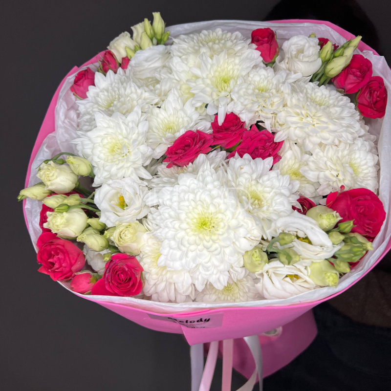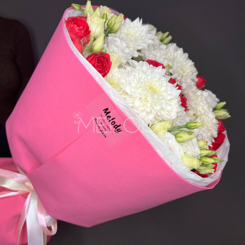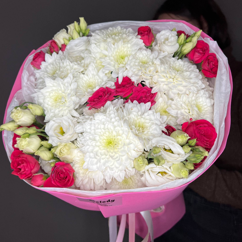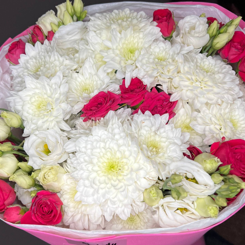 Нежный и выразительный букет, создающий идеальный баланс форм и оттенков. Четыре пушистые хризантемы задают ритм композиции, пять кустовых роз дарят объем и мягкость, а четыре изящные эустомы добавляют утонченности. Оформление в розовой упаковке завершает образ, делая букет идеальным подарком для особого момента.