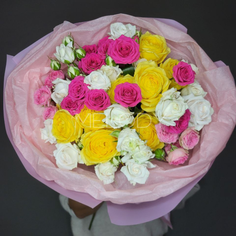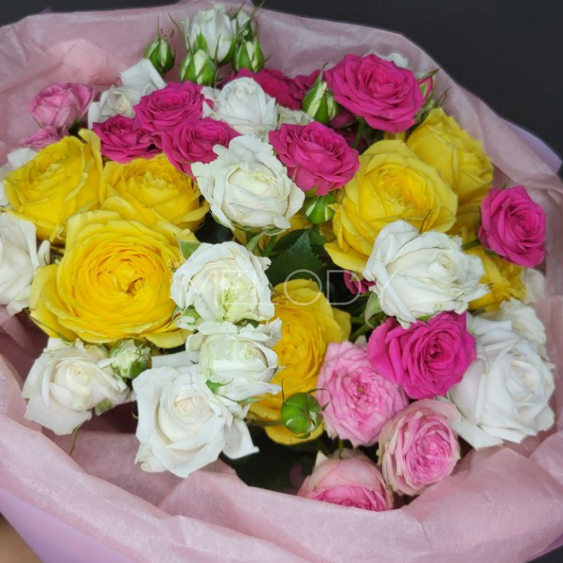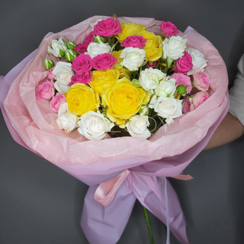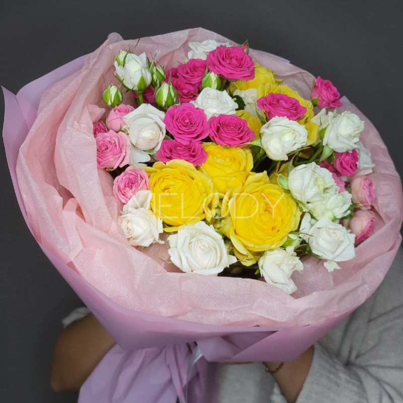 Роскошный букет из 11 пышных кустовых роз в нежной палитре. Каждый бутон — как отдельная нота в гармоничной мелодии, где персиковые, кремовые и розовые оттенки переплетаются в единую композицию. Идеальный подарок для создания праздничного настроения — будь то день рождения, годовщина или просто знак внимания.