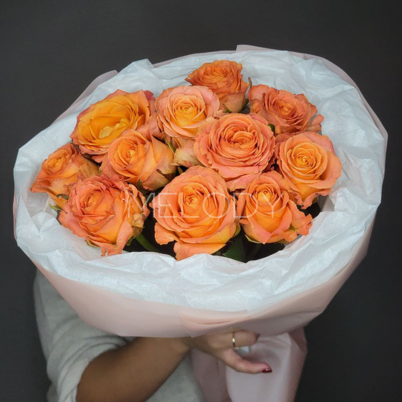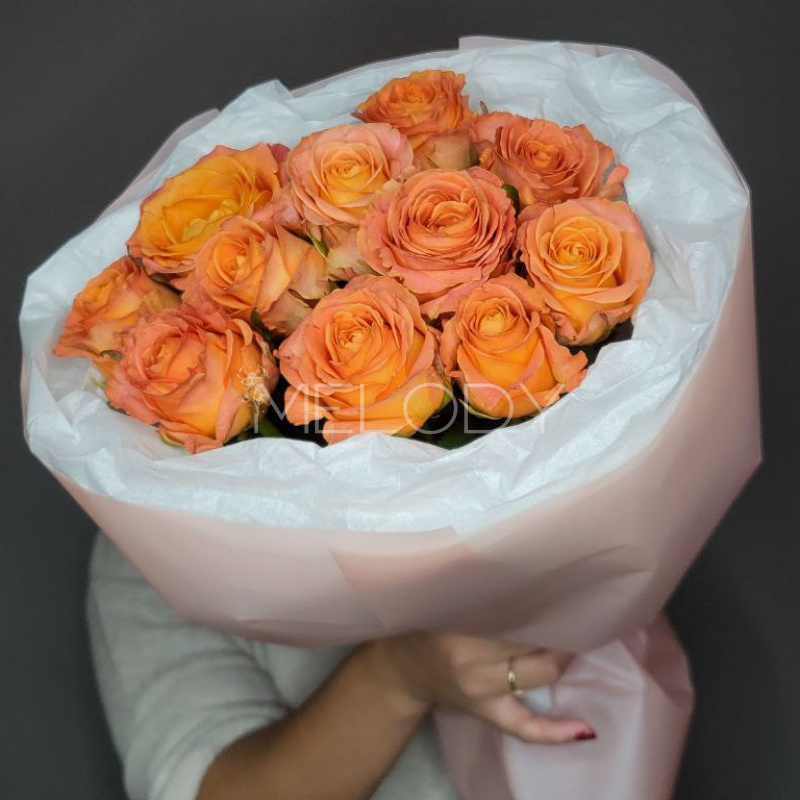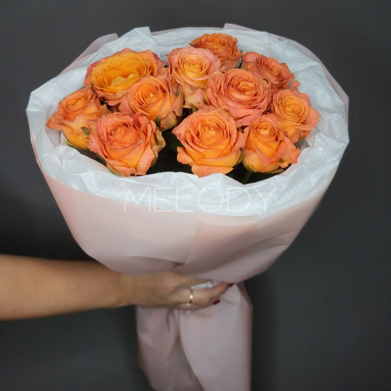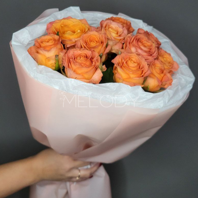 11 сочных оранжевых роз, зазвучавших по-новому в обрамлении нежно-розовой упаковки. Яркие, как солнечный свет, и тёплые, как летний вечер, они создают мелодию, полную жизни и энергии. Каждый бутон — уверенная нота в этой гармонии, а контраст с розовой упаковкой напоминает неожиданный, но прекрасный музыкальный переход.