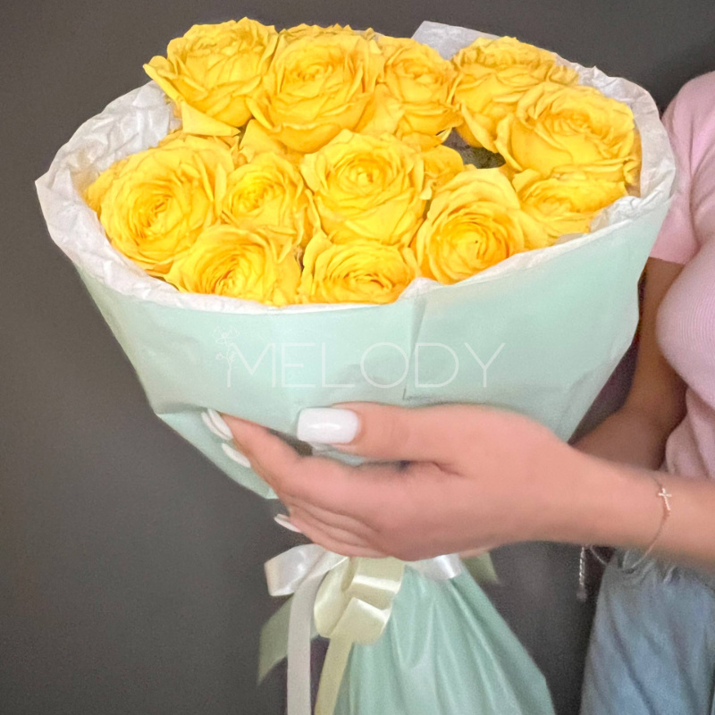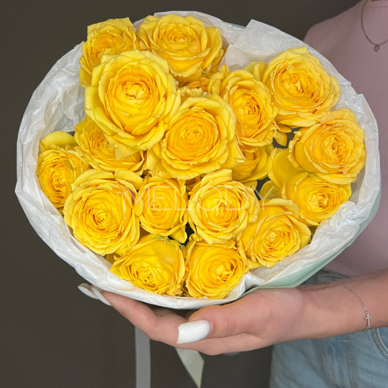 Пять пышных веток желтой кустовой розы создают легкую и радостную композицию, словно музыкальная увертюра к самому светлому дню. Яркие цветы напоминают переливы солнечных бликов, а нежная упаковка подчеркивает их естественную красоту. Идеальный подарок, чтобы поднять настроение, поздравить с достижением или просто напомнить о тепле.