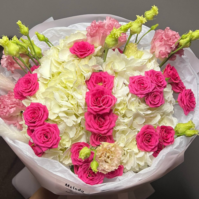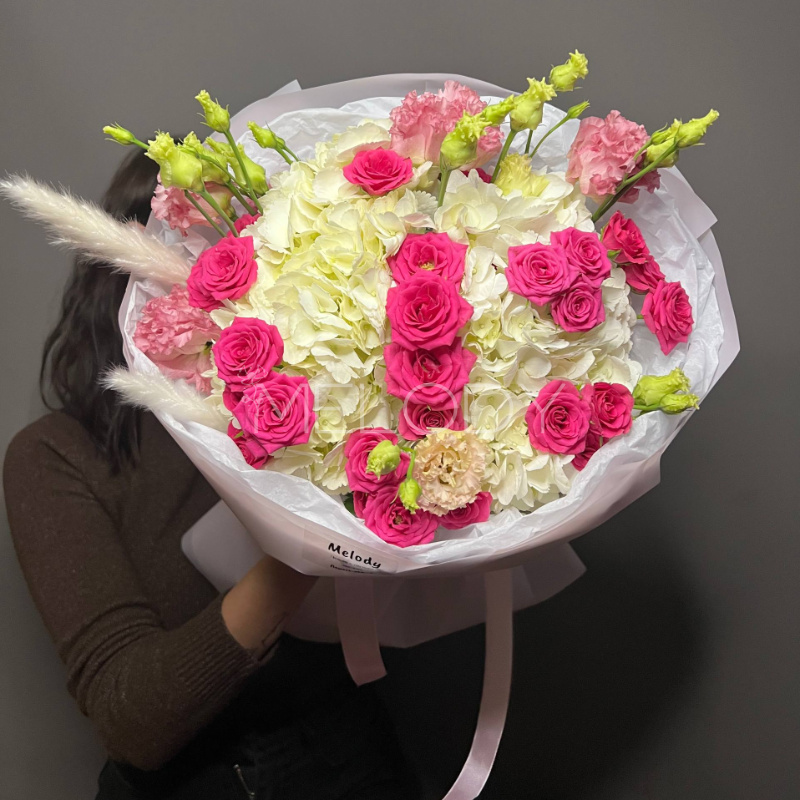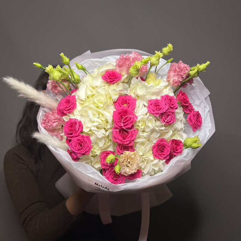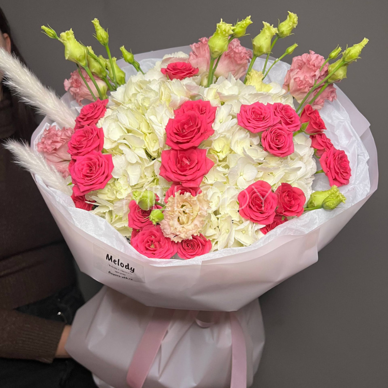 Эмоциональная и нежная цветочная рапсодия! Две пышные гортензии задают основной мотив, восемь кустовых роз развивают мелодию, а две изящные эустомы и воздушная кортадерия создают сложные музыкальные узоры. Бело-розовая упаковка становится изящным обрамлением этой свободной и выразительной композиции, где каждый элемент гармонично дополняет друг друга.