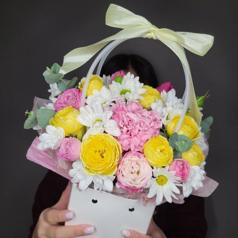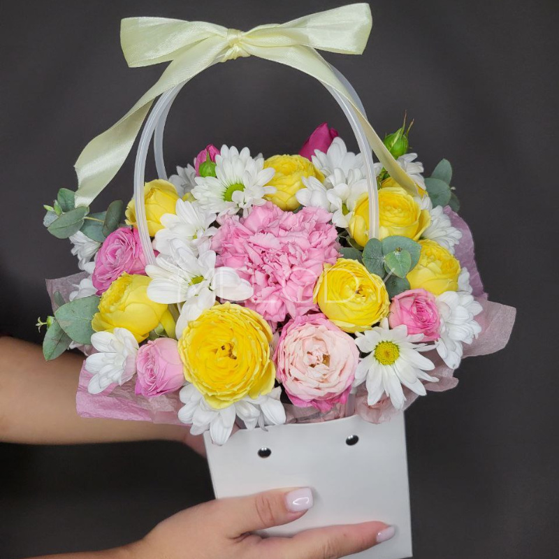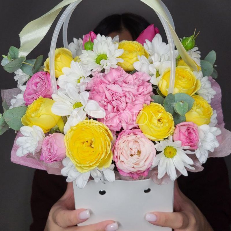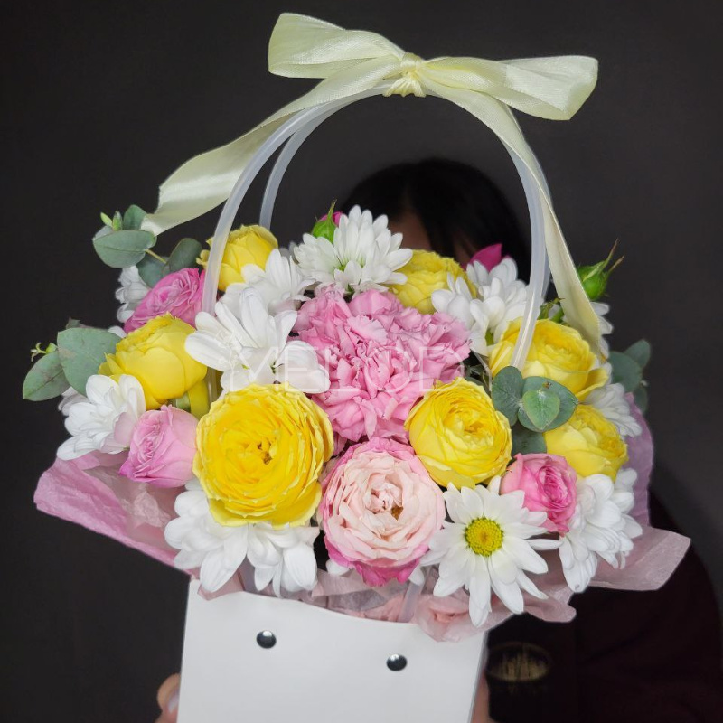 Очаровательная композиция в стильной сумке-кашпо, где нежные кустовые розы и пушистые хризантемы исполняют лёгкую мелодию, а диантус и эвкалипт создают гармоничный аккомпанемент. Как законченное музыкальное произведение, эта композиция готова стать идеальным спутником — её можно сразу подарить, не перекладывая в другую упаковку. Идеально для спонтанного сюрприза, дня рождения или романтической встречи.