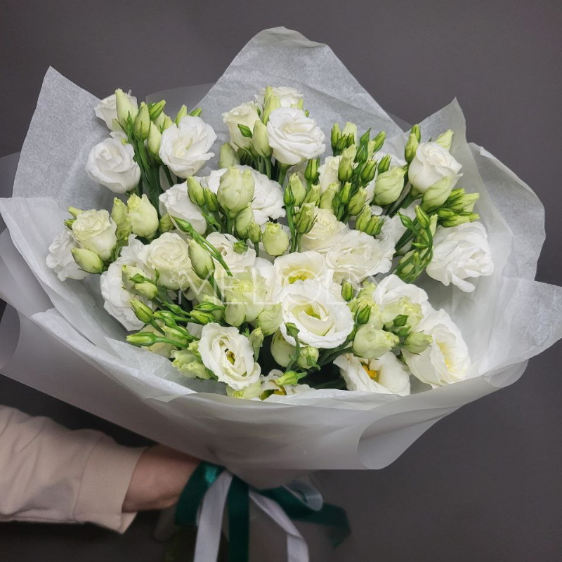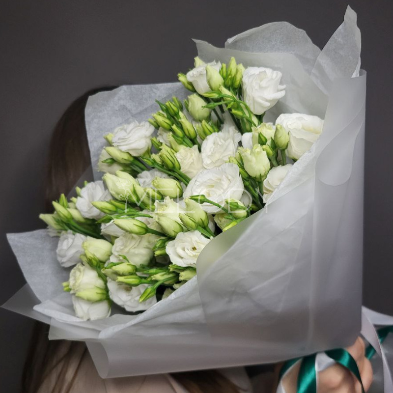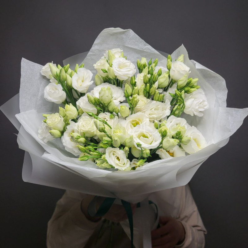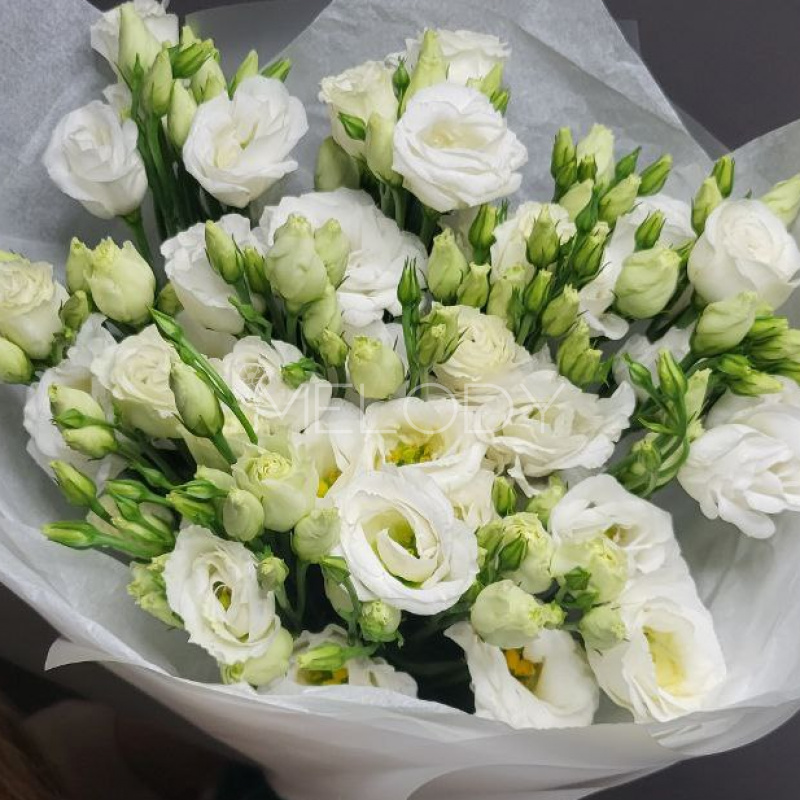 Девять изящных эустом в матовой белой упаковке — это монохромная поэзия, застывшая в форме идеального букета. Каждый бутон, словно нота в тихой мелодии, раскрывается постепенно, демонстрируя тонкую грацию и изысканность. Такой букет — воплощение элегантности, чистой эстетики и сдержанной роскоши.