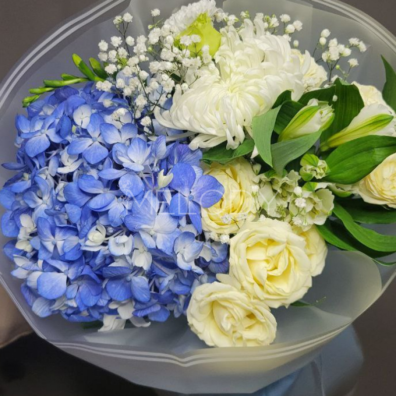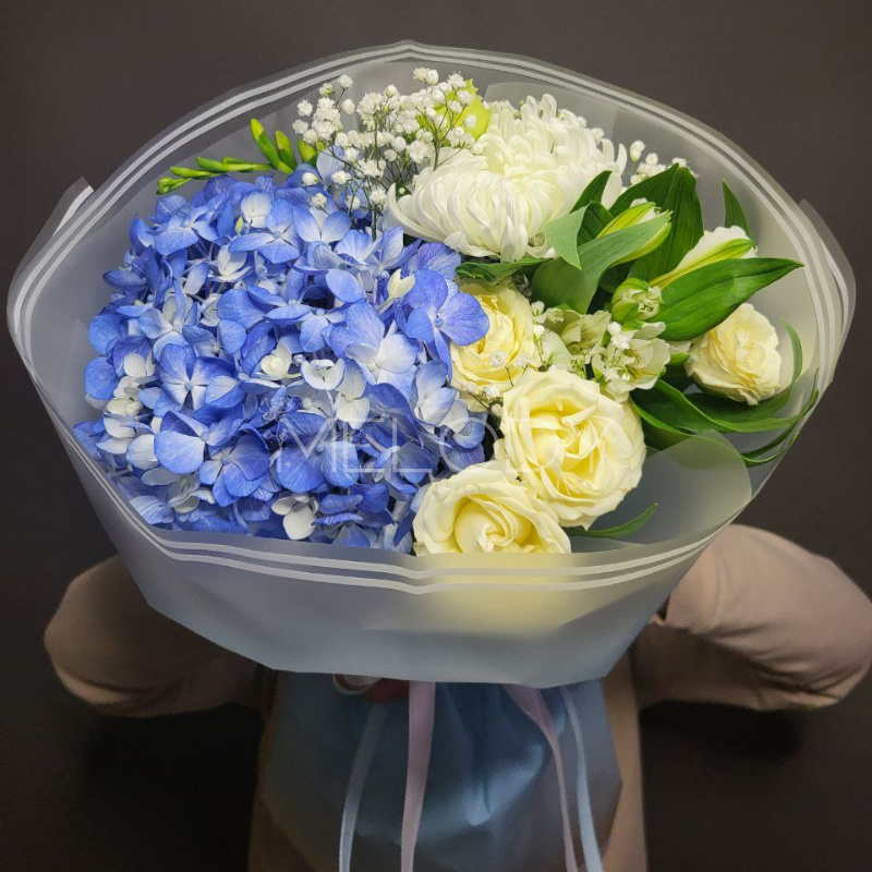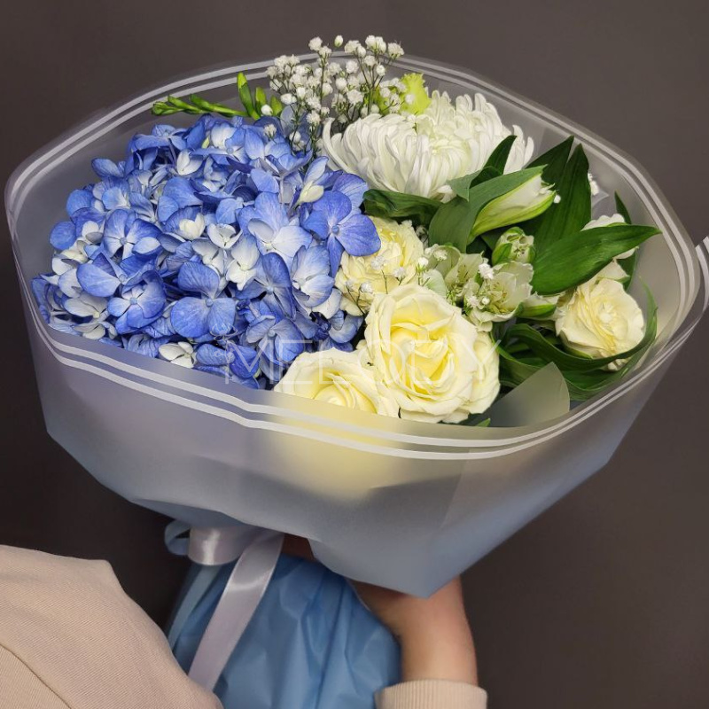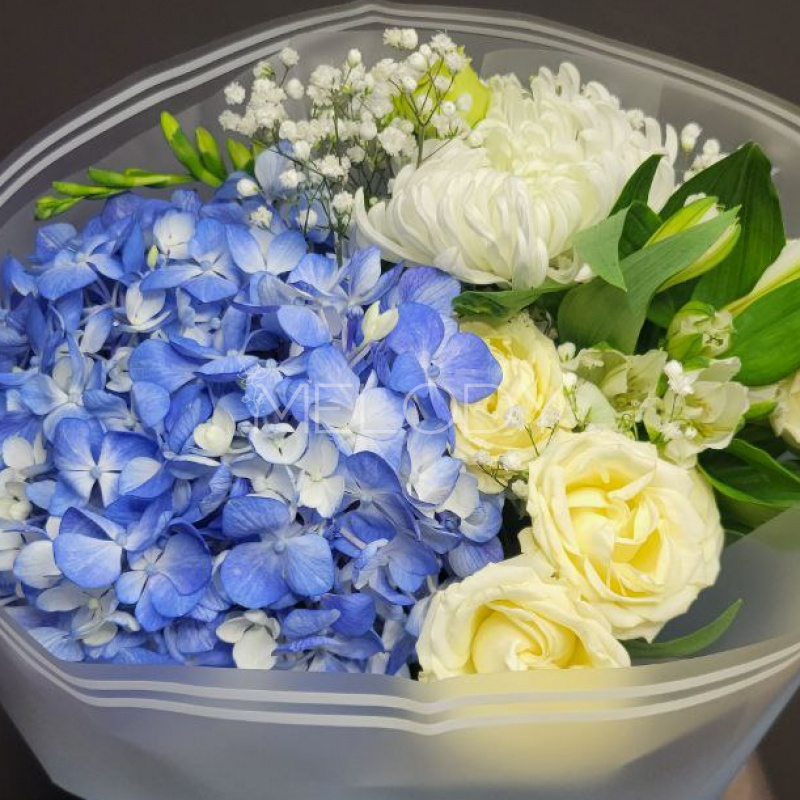 Нежная композиция, где пышная гортензия задает основной ритм, а две кустовые розы и хризантема создают гармоничный аккомпанемент. Альстромерия добавляет тонкие цветовые переходы, а гипсофила придает воздушность, словно легкое музыкальное интермеццо. Упакованный в матовую белую бумагу, этот букет звучит как тихая, но выразительная мелодия, идеальная для романтического свидания или в качестве знака внимания.