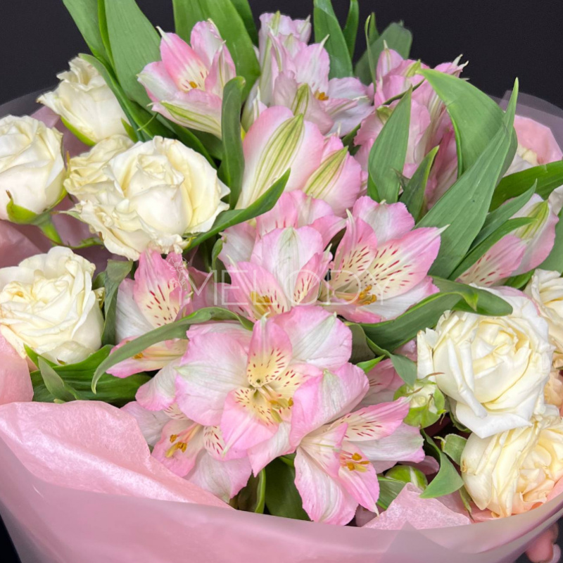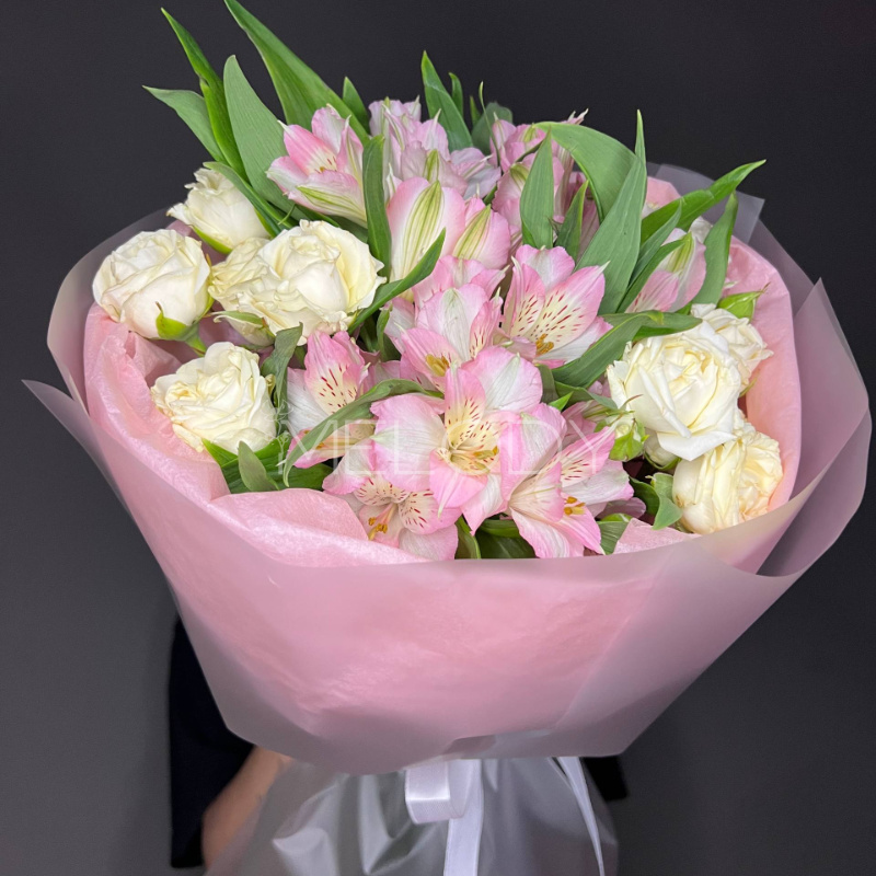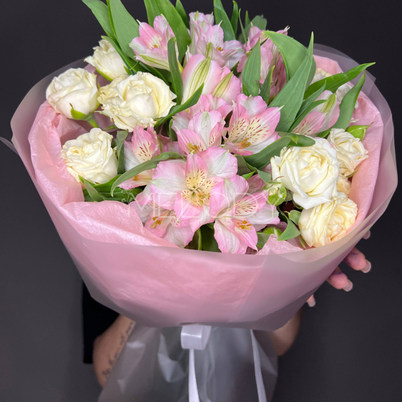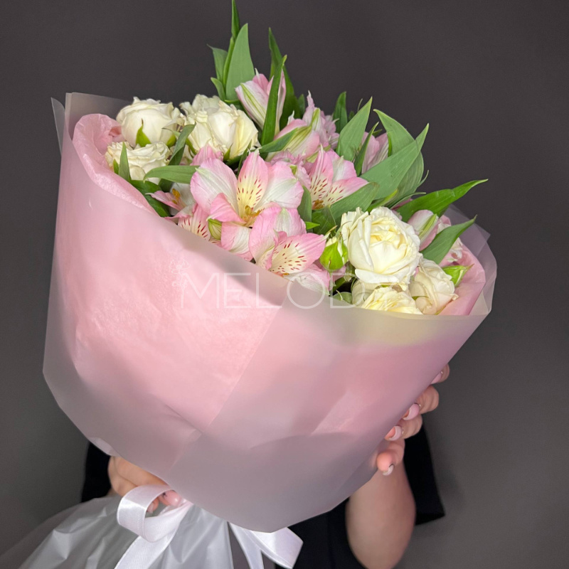 Лёгкая и воздушная композиция, где две пышные кустовые розы ведут главную мелодию, а пять нежных альстромерий создают гармоничный аккомпанемент. Этот букет словно музыкальное произведение для камерного ансамбля — сбалансированное, изящное и наполненное нежностью. Идеально подходит для спонтанного подарка, дня рождения или просто как знак внимания.