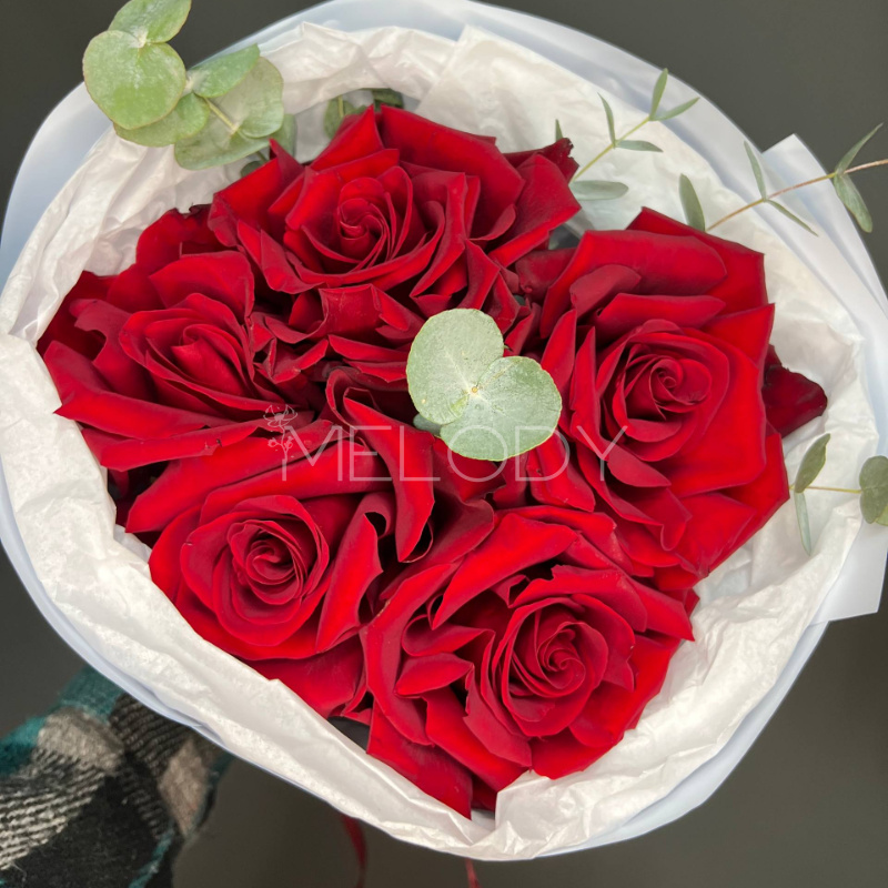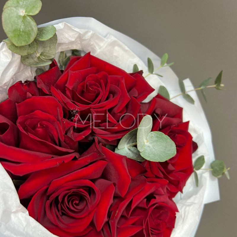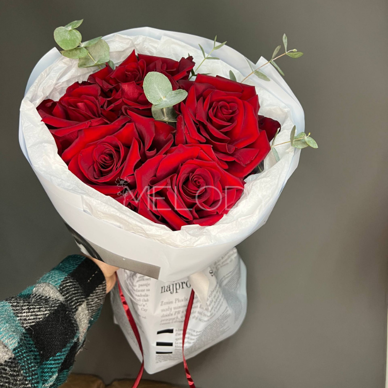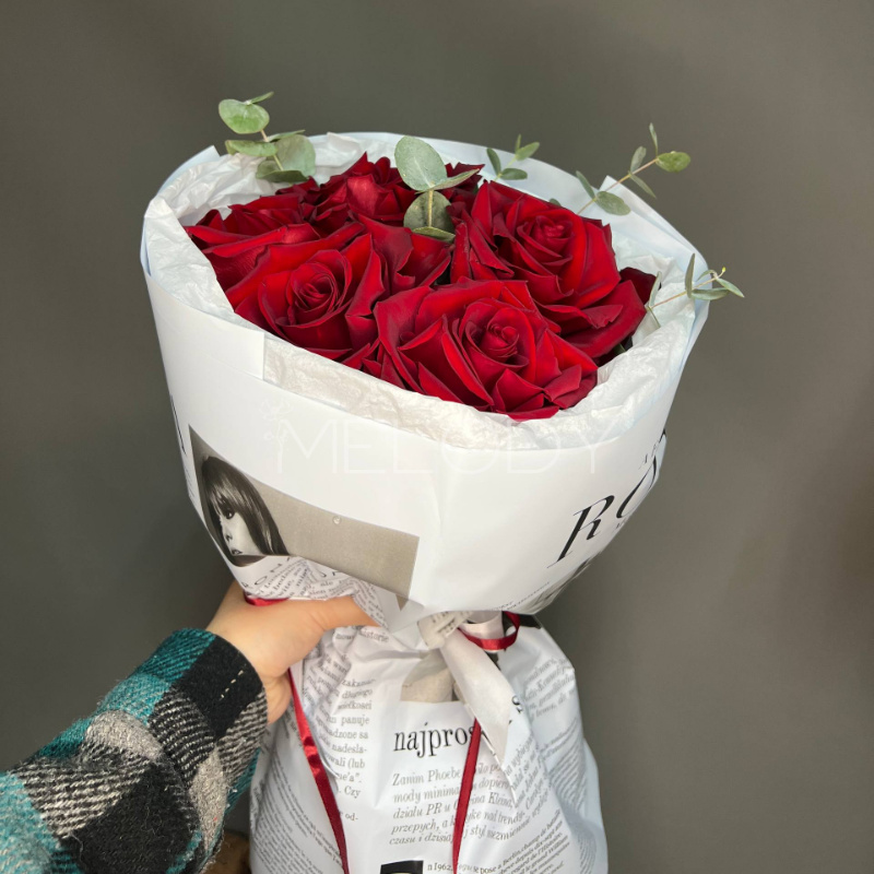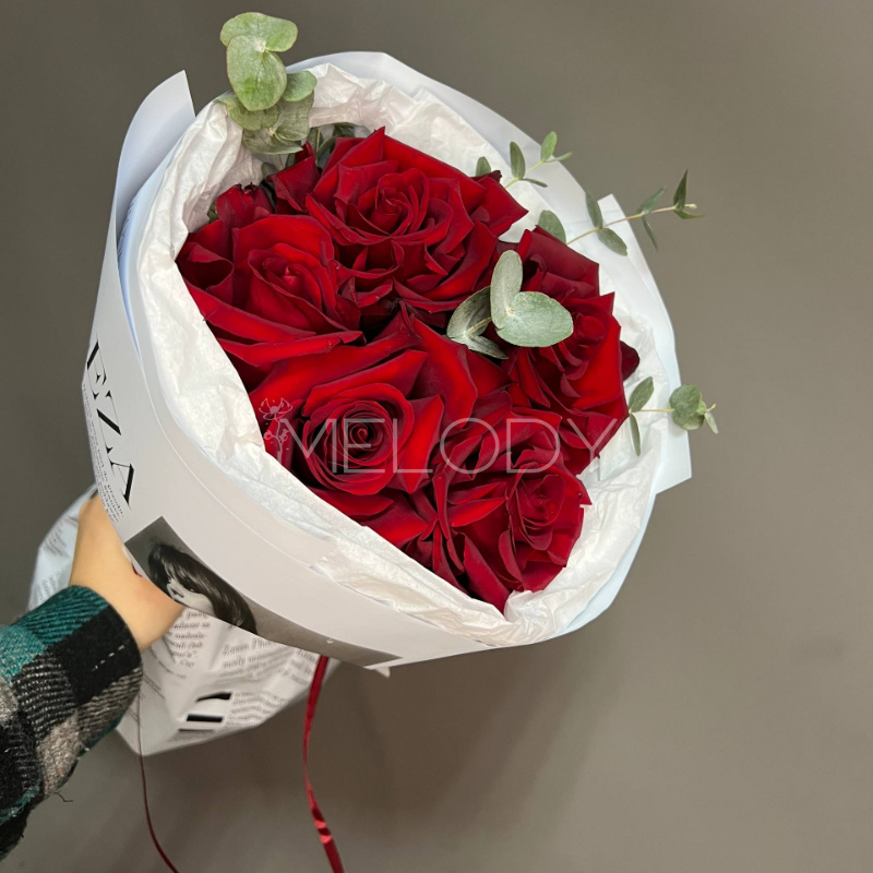 Букет, в котором виртуозность сочетается со страстью. Напористый ритм алых французских роз и строгий аккомпанемент эвкалипта в аранжировке из белой газетной бумаги. Это не просто цветы — это мощное музыкальное заявление. Для тех, кто привык выражать чувства ярко и смело.