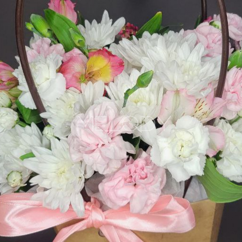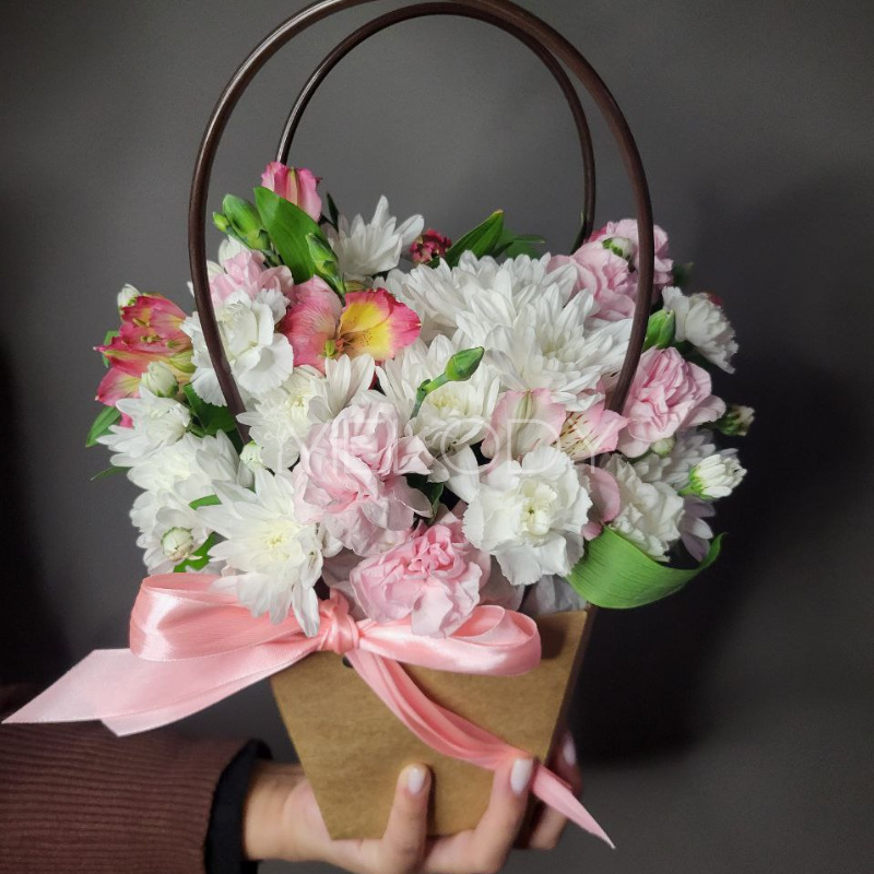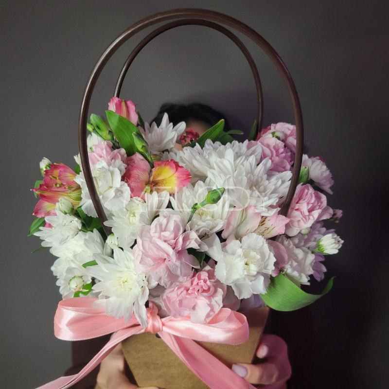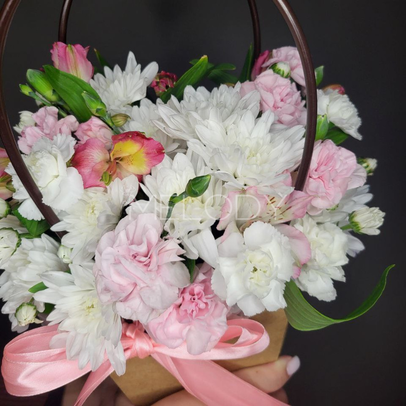 Очаровательная композиция в стильной сумке, где пушистые хризантемы и нежные альстромерии задают лёгкую мелодию, а кустовой диантус и изящный рускус создают гармоничный аккомпанемент. Как законченное музыкальное произведение, эта композиция готова стать идеальным спутником — её можно сразу подарить, не перекладывая в другую упаковку. Идеально для спонтанного сюрприза, дня рождения или романтической встречи.