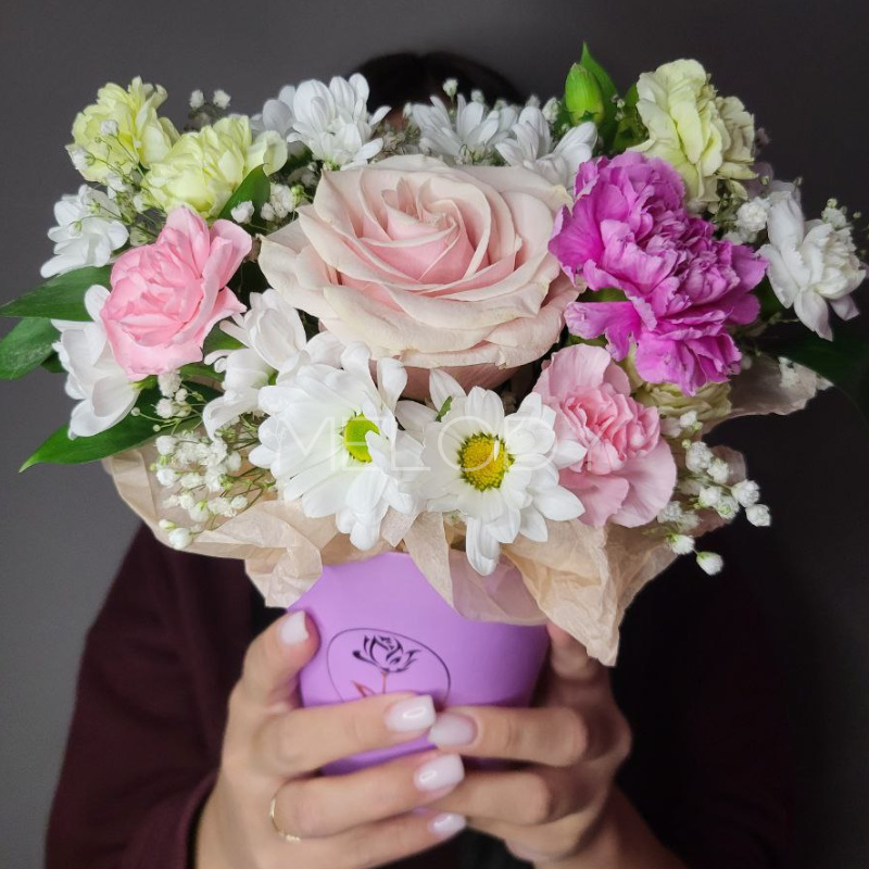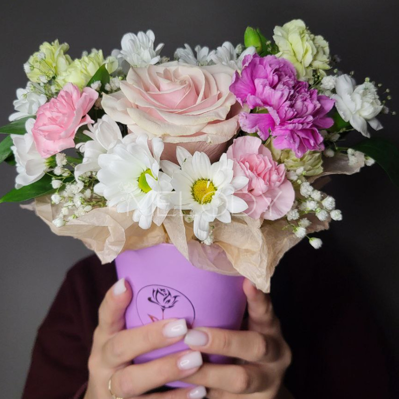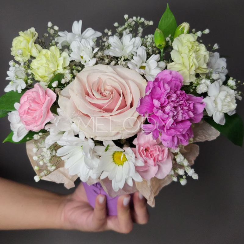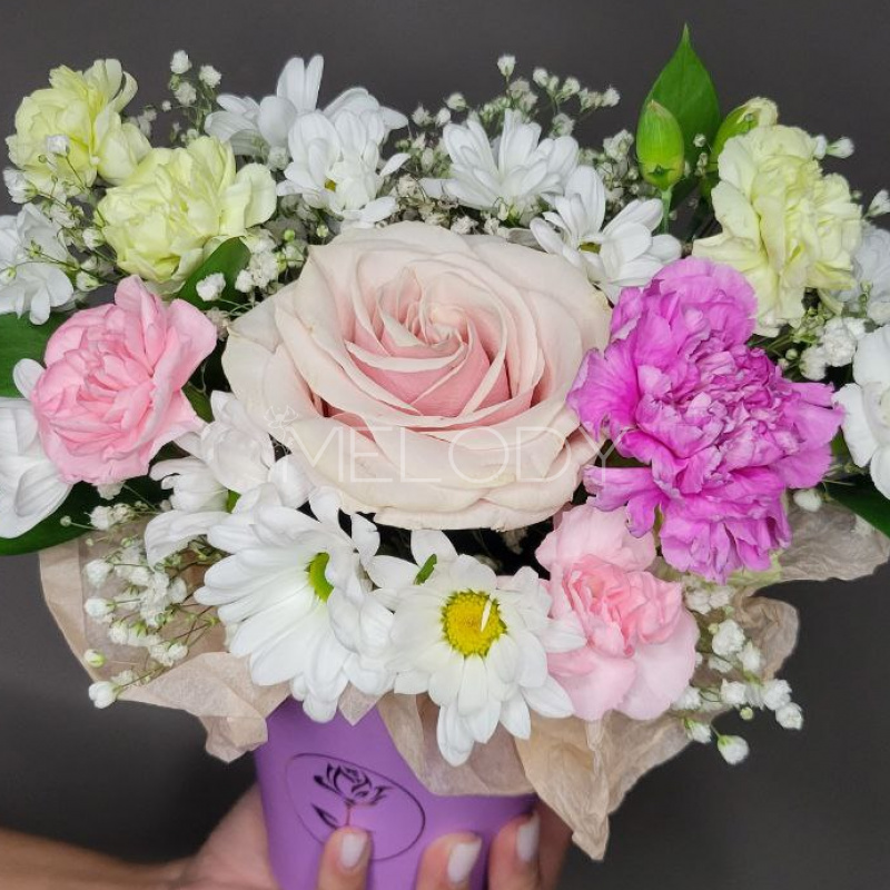 Изящная композиция в стакане, где роза и хризантема исполняют сольные партии, а кустовой диантус и воздушная гипсофила создают лёгкий аккомпанемент. Рускус добавляет завершающий аккорд, придавая композиции структурность и элегантность. Идеальное решение для украшения интерьера, рабочего стола или в качестве тактильного подарка, наполненного гармонией и уютом.
