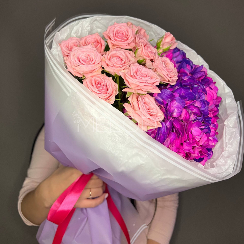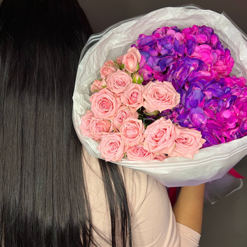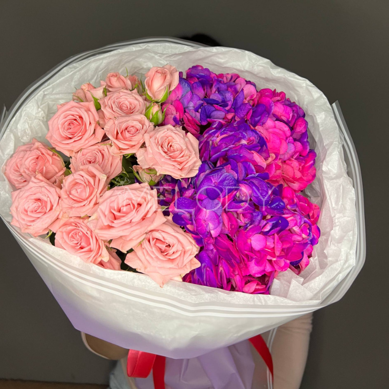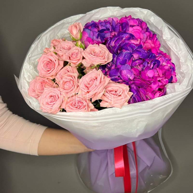 Изысканный букет, где две пышные гортензии и пять нежных кустовых роз создают гармоничный дуэт. Объемные соцветия гортензии мягко контрастируют с изящными бутонами роз, образуя композицию, полную нежности и элегантности. Букет станет прекрасным подарком на свидание, день рождения или в качестве знака внимания близкому человеку.